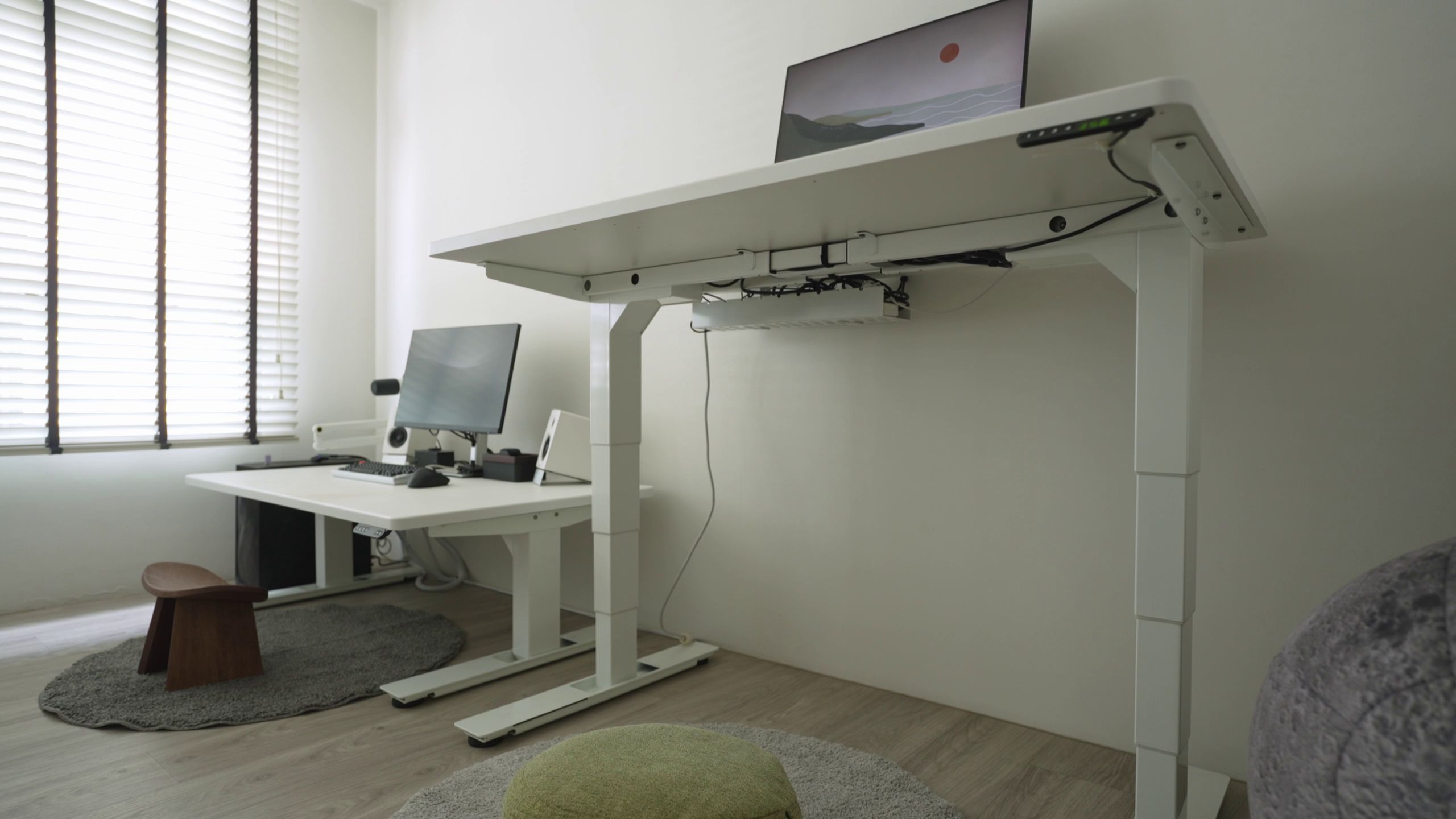 The Flow desk on the other hand, also surprised us in the noise department. It is super quiet! At the bottom of its operational height, the desk is practically silent. When our fans are running, and cars are going by outside, we can barely hear the desk moving. As it enters the upper half of its operational range, the volume gets a tiny bit louder, but you have to be paying attention to hear it.