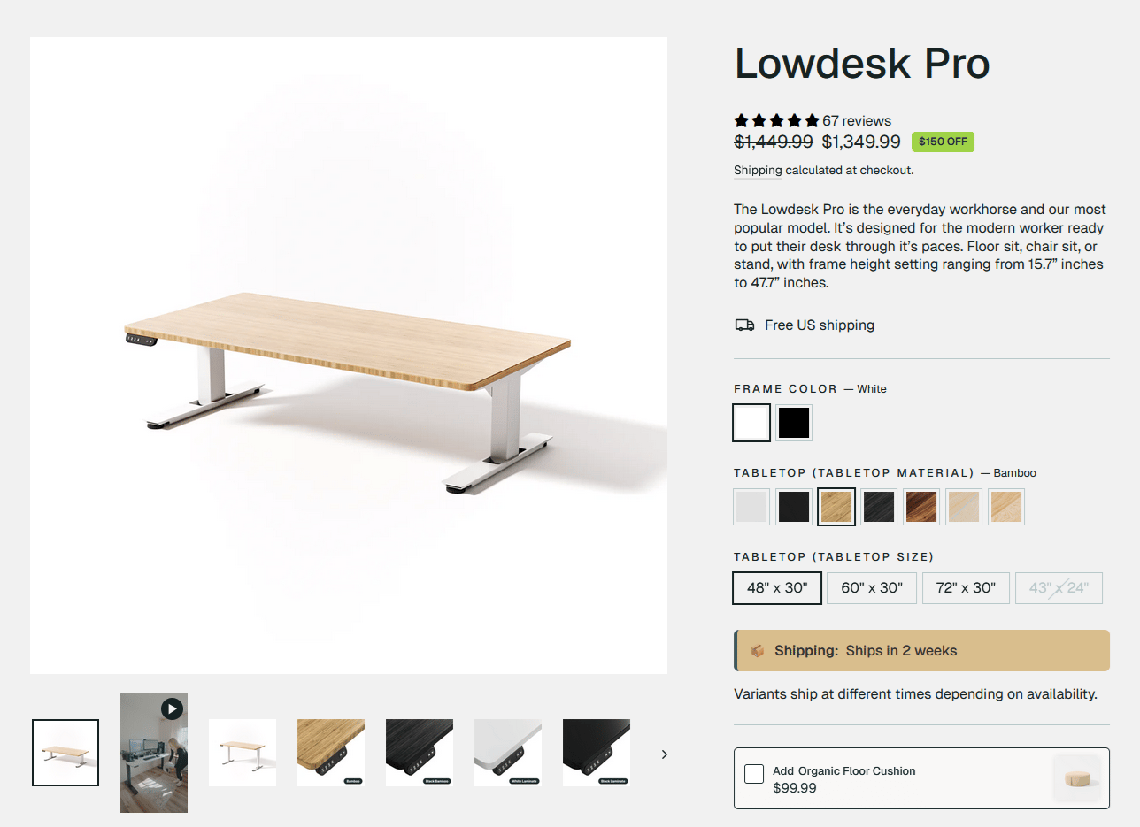 As of this video, the Flow Desk is priced at USD1049, while the Lowdesk Pro starts at USD1300 with a laminate tabletop, USD1350 with a bamboo tabletop, and up to USD1900 for one with a wooden tabletop.